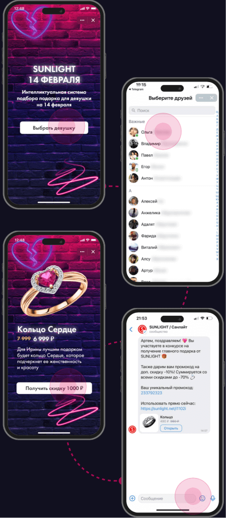 Сервис для рекомендации подарков на 14 февраля. Пользователь заходит на страницу приложения, выбирает друга и ему предлагаются разные товары в зависимости от данных профиля ВКонтакте.