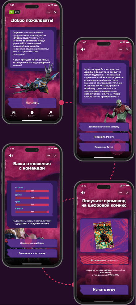 Текстовый квест, в котором пользователь, в роли Питера Квила, принимает решения, как действовать его команде в той или иной ситуации, а в конце получает промокод на бесплатный комикс об игре.