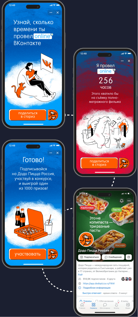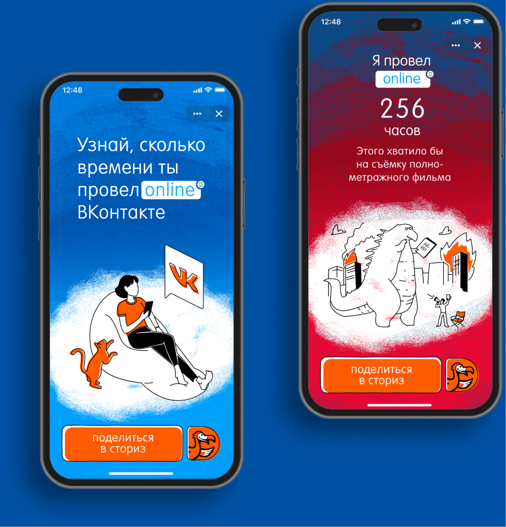 Сервис анализировал время, которое пользователь проводит онлайн ВКонтакте и показывал, на что он мог бы это время использовать. В конце пользователю предлагалось поделиться информацией в «Историях»