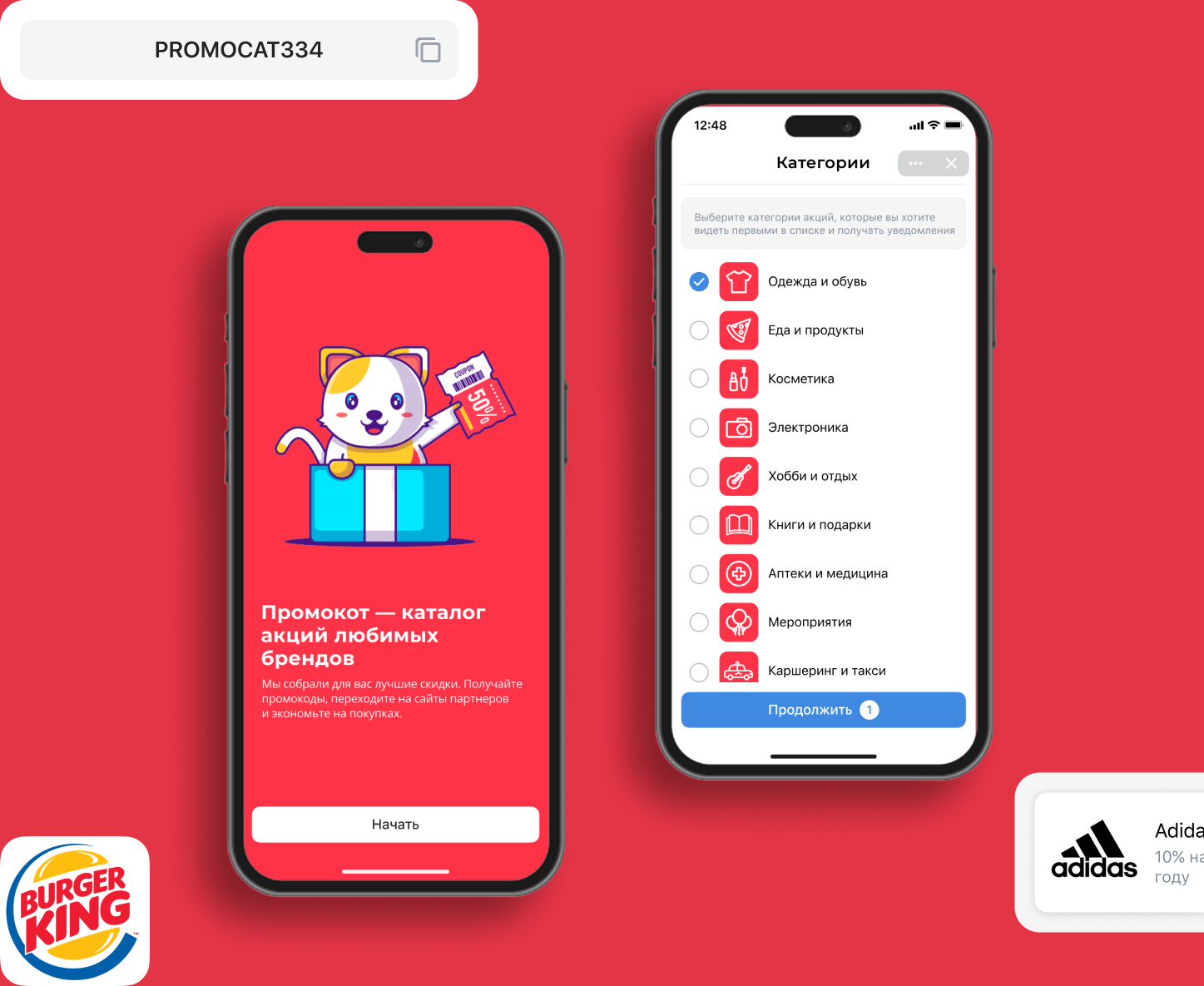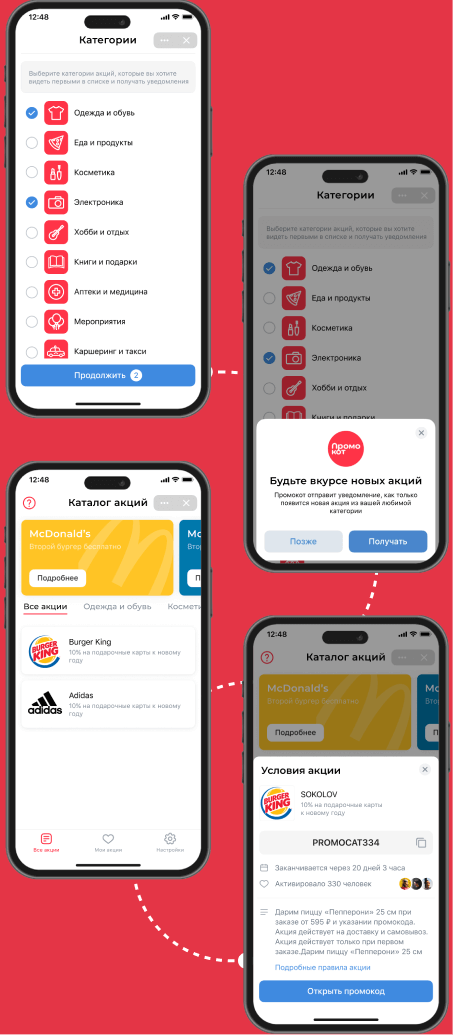 Сервис собирает информацию об акциях различных брендов, помогая пользователям сэкономить на покупках. Пользователь может выбрать акцию, активировать промокод и подписаться на push-уведомления.